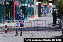 Главная набережная курорта оцеплена бойцами Росгвардии. Табличка призывает оставаться дома. А вот входы на остальные муниципальные пляжи охраняют куда более легко преодолимые преграды.