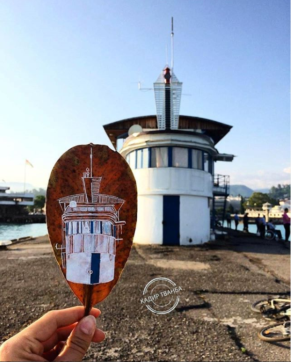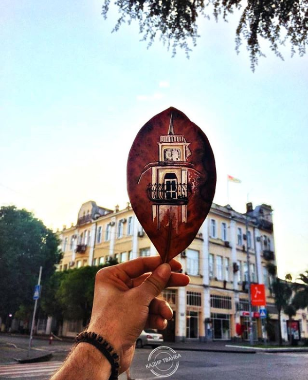 Другим своим ярким проектом Кадир считает этот, с разрисованными листьями. Изображая на них архитектурные формы, художник фотографировал получившиеся работы так, чтобы они совпадали с размером настоящих зданий. Так он одновременно показывал, сколь безграничным может быть искусство, и обращал внимание на облик Сухума.