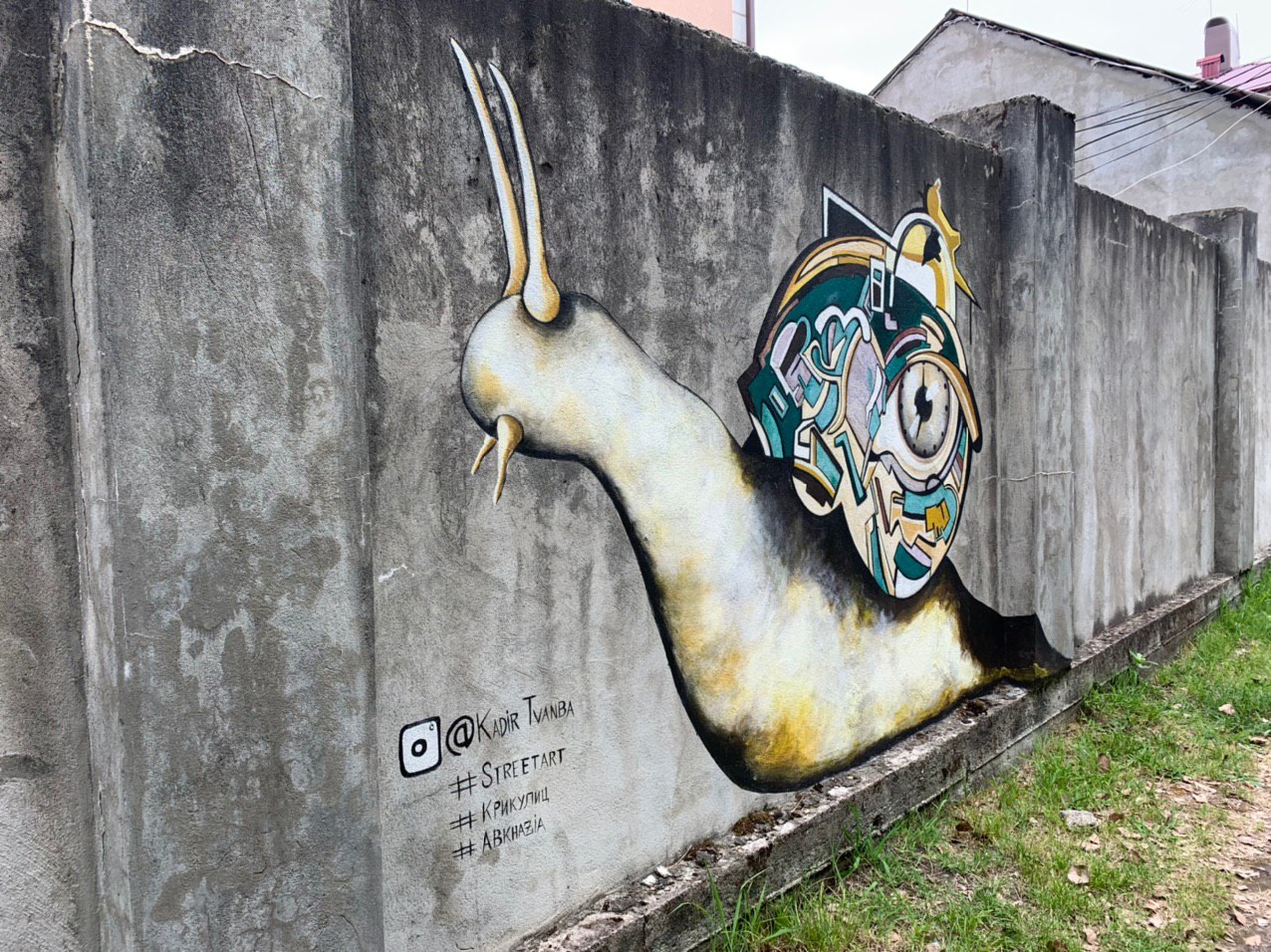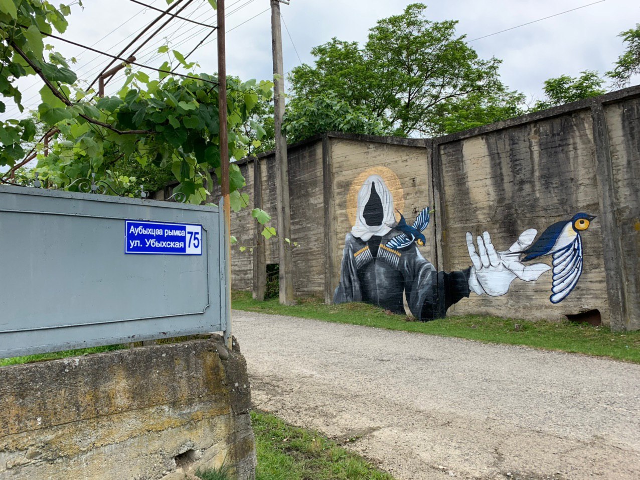 Так выглядит самый большой стрит-арт в Сухуме. Правда, чтобы его найти, надо подняться в горную часть города – на улицу Убыхская. Именно с названием улицы художник связывает выбор места изображения.