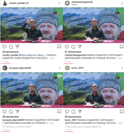 По команде своего куратора тролли также публикуют видеоклипы и фотографии, обосновывающие позицию чеченских властей. Так, 13 июня на пике резонансного обсуждения границ ЧР и Дагестана работники "фабрики" опубликовали видеозаписи с практически идентичными названиями, в которых Кадыров высказывается по поводу снесенного дорожного знака.