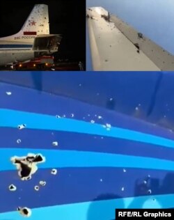 Слева – хвостовой вертикальный стабилизатор российского Ил-22, сбитого в результате "дружеского огня" и совершившего аварийную посадку в Анапе в январе 2024 года. Справа – хвостовой стабилизатор упавшего в Казахстане самолета "Азербайджанских авиалиний". Внизу – отверстия со вдавленными внутрь краями на его фюзеляже: